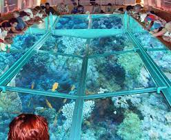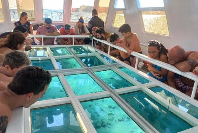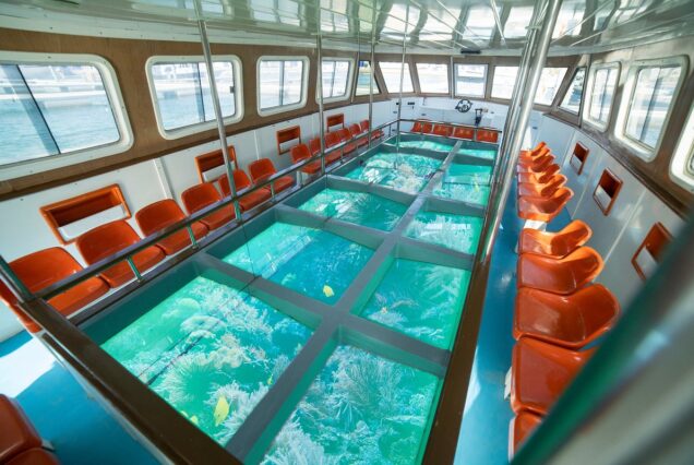 المرور على الشعاب المرجانية يمر القارب فوق منطقة قاعها زجاجي، وتنظر من خلاله إلى الشعاب والأسماك عن قرب 20–40 دقيقة تقريبًا
